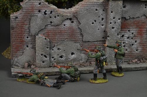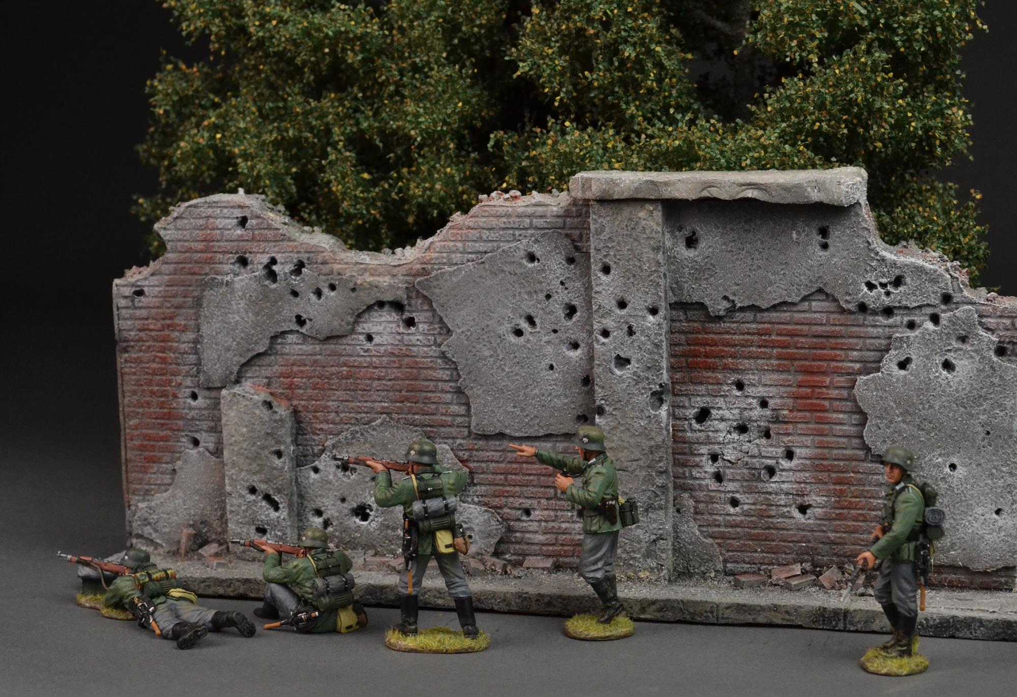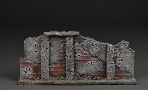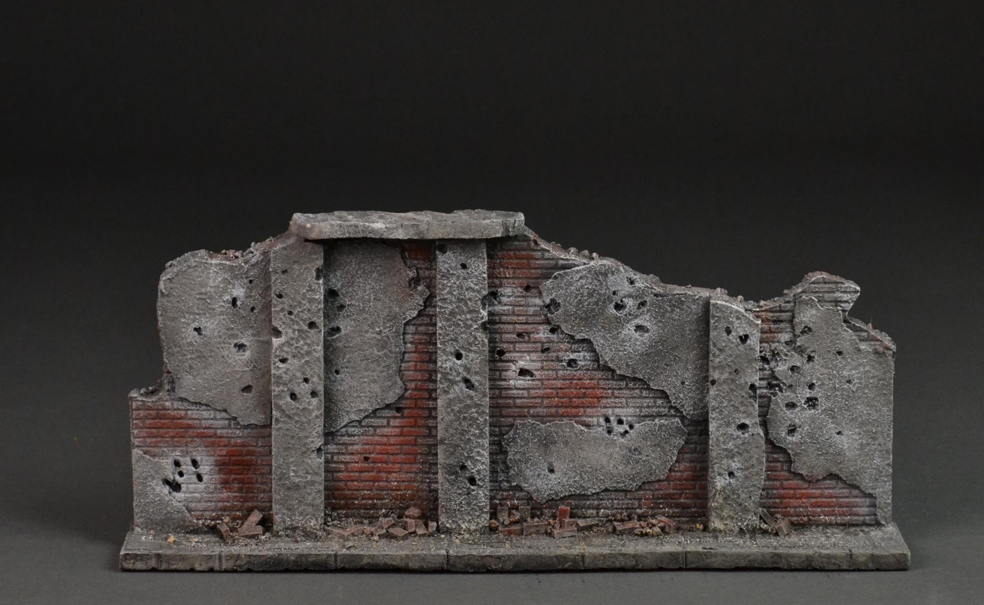 “A brick wall remains with falling plaster after shelling and bombing. The traces of war are clear...