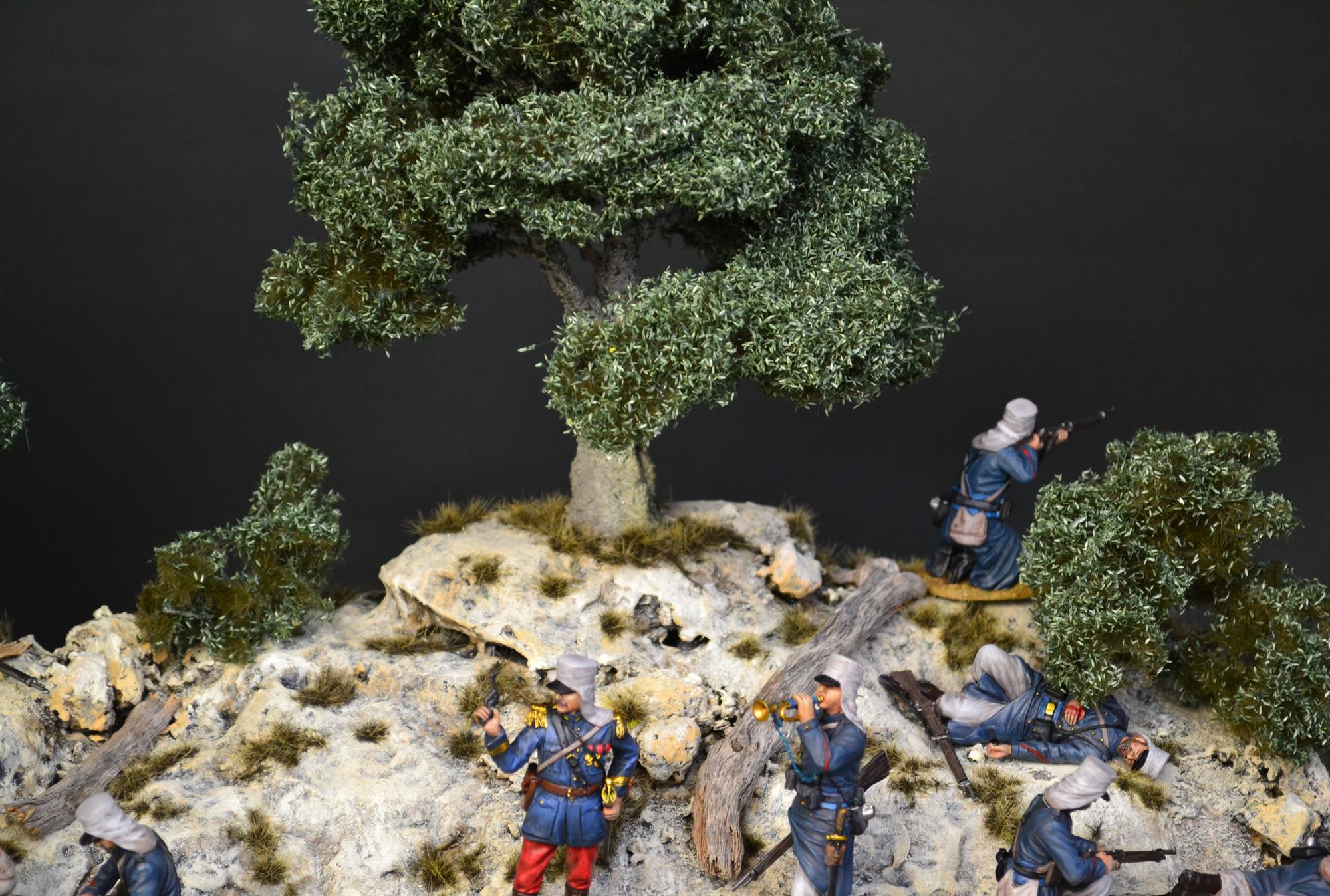 Et stemningsfuldt klippelandskab med smukt formede, håndlavede oliventræer og små buske