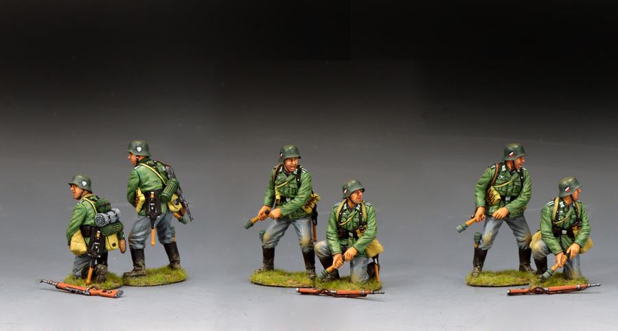 Disse to grenaderer er lige ved at trække i snoren inde i håndtaget på deres 'Stielhandgranat', hvilket igen vil tænde lunten. Grenaderen ville derefter have cirka 4 1/2 sekunder til at kaste granaten mod fjenden, før den eksploderer.