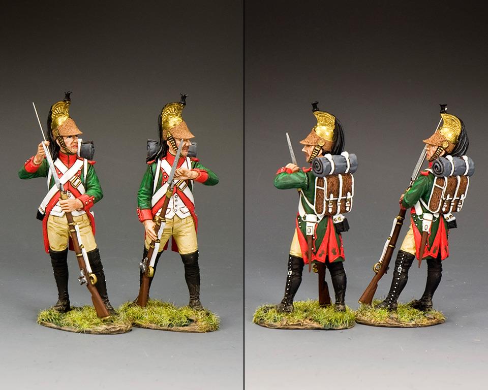 They did however retain their tall brass helmets complete with black horsehair plumes and the traditional, green tunics of French Light Cavalry and Infantry as well as their long dragoon muskets.
