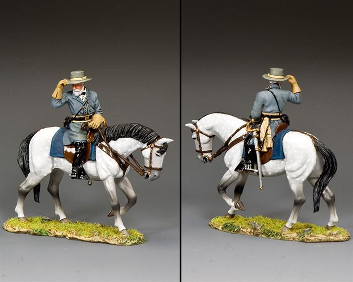 Robert Edward Lee is the most famous Confederate General of the American Civil War and commanded the Army of Northern Virginia from 1862 until its surrender at Appomattox Court House on April 9, 1865. The son of a notable Revolutionary War officer, Henry ‘Light Horse Harry’ Lee, Robert was a top graduate of West Point and destined for a glittering military career in the U.S. Army’s Corps of Engineers. After 32 years in the regular American Army, Robert E. Lee resigned his commission in 1861 after exceptional service during the Mexican-American War of 1849 and holding the post of Superintendent of West Point from 1852 until 1855. Confederate president Jefferson Davis then appointed Lee commander of the recently-formed Army of Northern Virginia. For the next four years Robert E. Lee was to lead his forces the length and breadth of the Eastern half of the United States winning and losing battles against a great number of Union generals and the growing strength and power of the Union Army. Although personally opposed to slavery he fought for a Confederacy that strived to retain it. Our figure shows him mounted on his favourite horse, “Traveller”, an American Saddlebred of 16 hands high. Lee acquired the horse in early February 1862 and rode him in many famous battles and actions. When Robert E. Lee died in 1870 his horse “Traveller” died a few months later in 1871.