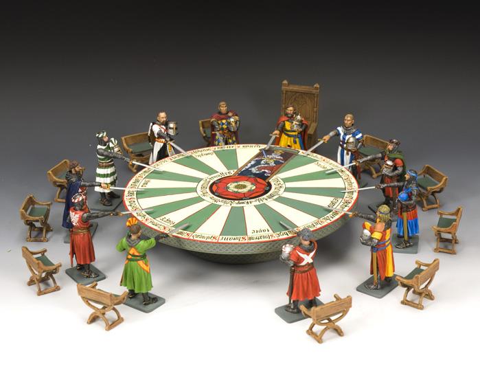 Entdecken Sie hier den edlen Galahad, den tapferen Sir Lancelot und seine treuen Gefährten Bedivere, Caradoc und Tristram. Ebenfalls an der Tafel sitzen die Ritter Peleas, Gawain, Lamorak, Lucan Geraint und, leider, der böse Verräter Mordred.