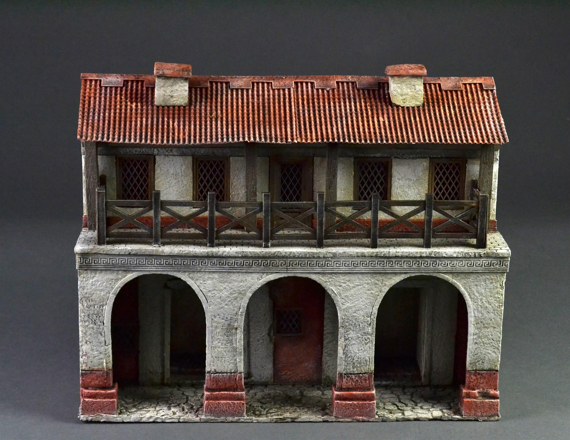 Römische zweistöckige Ladenfront mit Bögen und Balkon.