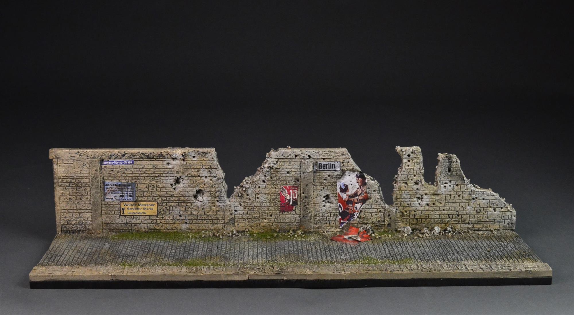 „Bombardierte und beschossene Mauer mit Nazi-Propagandaplakaten“