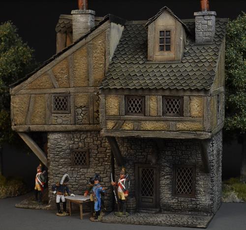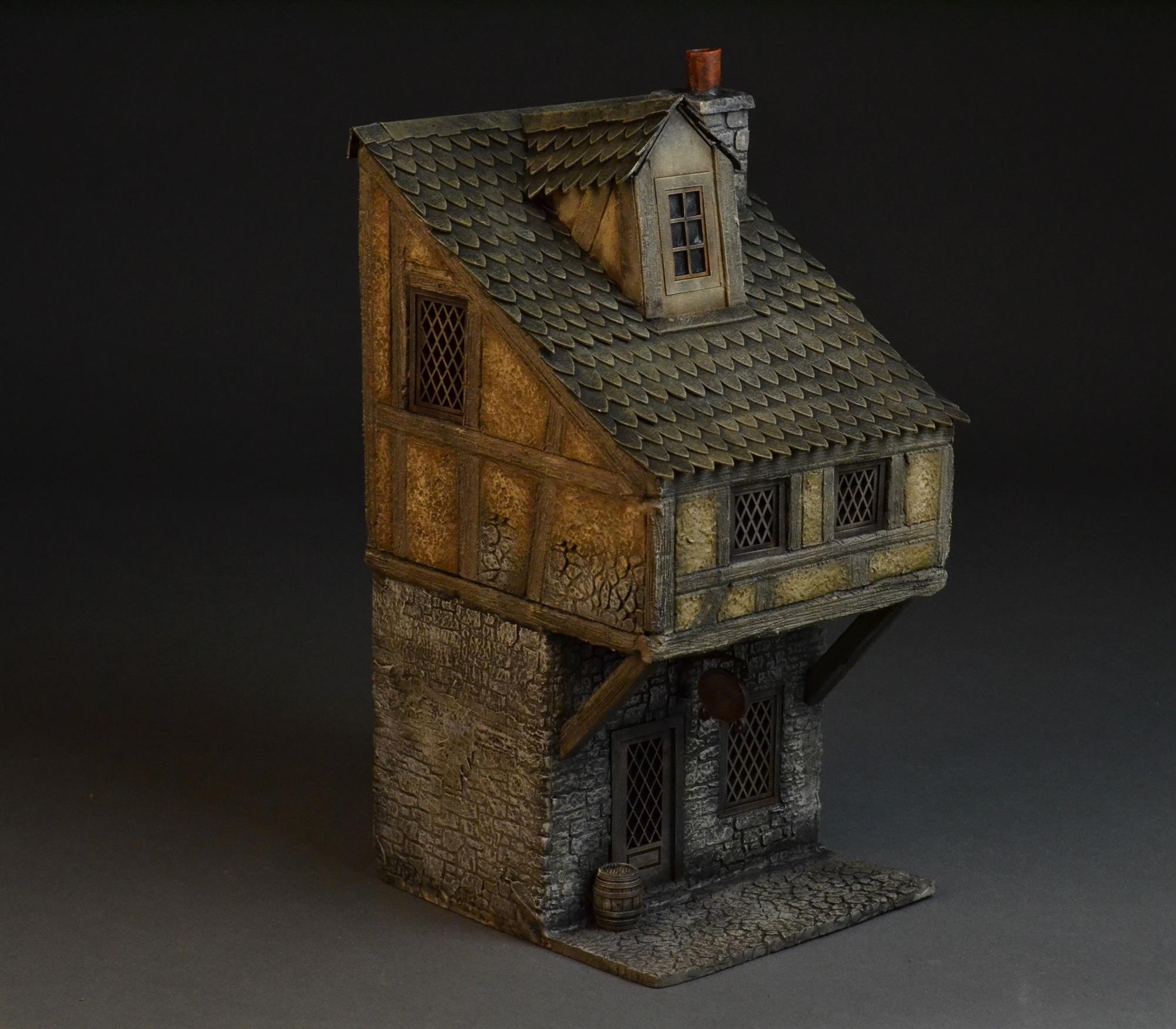 Ein dreistöckiges Haus aus dem Mittelalter mit ockerfarbenem Putz und hellem, verwittertem Holzwerk. Das Dach ist mit bräunlich-grünen, spitz zulaufenden Ziegeln gedeckt, die dem Gebäude einen zeitlosen und antiken Charme verleihen.
