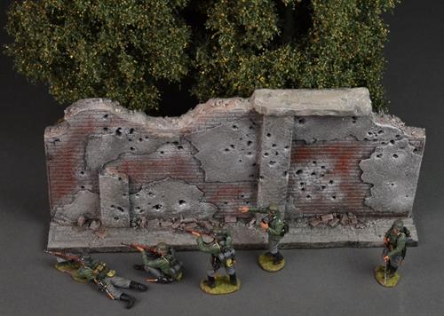 „Nach Beschuss und Bombenangriffen ist eine Ziegelmauer mit abblätterndem Putz zurückgeblieben. Die Spuren des Krieges sind deutlich sichtbar…